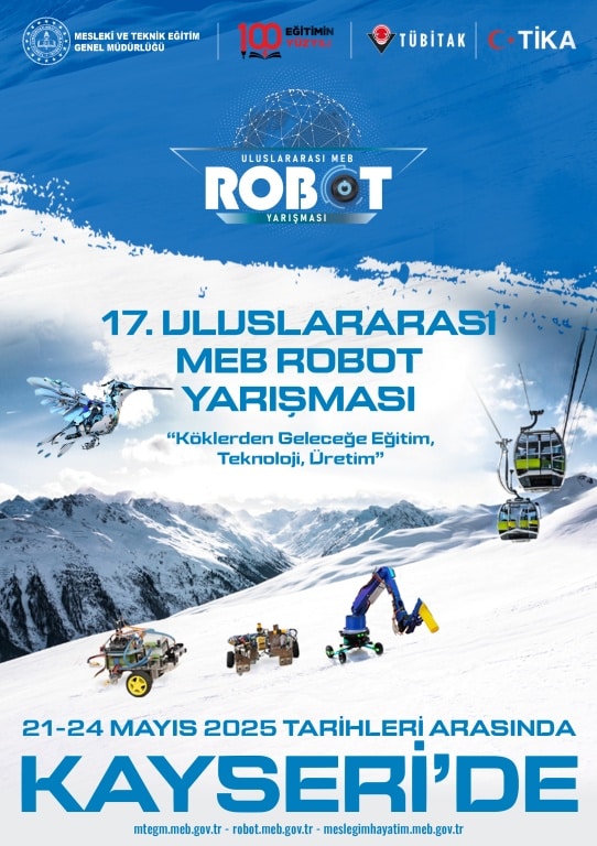 Bu yıl 17’ncisi düzenlenecek olan Türkiye’nin en büyük, dünyanın ise sayılı büyük robot yarışmalarından biri olan Uluslararası MEB Robot Yarışması, Millî Eğitim Bakanlığı Meslekî ve Teknik Eğitim Genel Müdürlüğü koordinasyonunda, TÜBİTAK ve TİKA iş birliğiyle 21-24 Mayıs 2025 tarihlerinde Kayseri’de gerçekleştirilecektir.